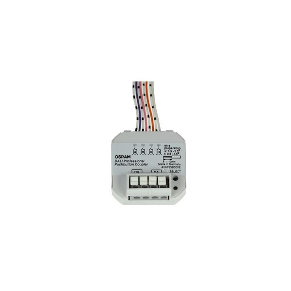 DALI Tasterkoppler. Binäreingabegerät zum Einlegen in eine UP-Dose. Spannungsversorgung über die angeschlossene DALI-Leitung. 4 Eingangskanäle für potenzialfreie Kontakte. Es können herkömmliche Installationsschalter oder Installationstaster angeschlossen werden.