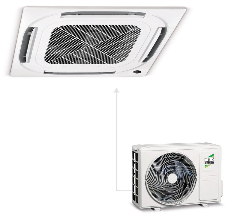 Innengerät der Raumklima-Kombination RVD 1055 DC mit Inverter zum Kühlen und Heizen. Innengerät zur Montage in Zwischendecken mit Einzel-Euroraster-Abmessungen.