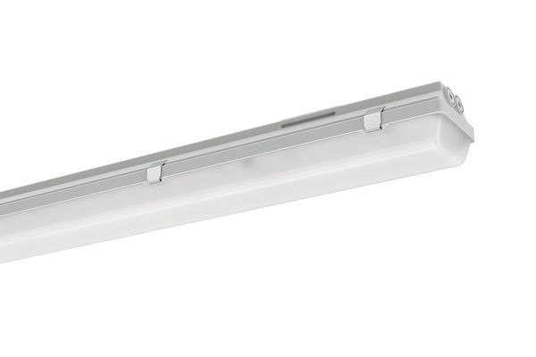 Deckenleuchte der PFLO-Produktfamilie. Lichtlenkung durch Abdeckung längsprismatisch, Ausstrahlungscharakteristik symmetrisch, diffus strahlend, Lichtaustritt direkt. Leuchtmittel LED-M eingebaut, Austausch durch Fachkraft möglich. Die Leuchte generiert einen Bemessungslichtstrom von 6020 lm in Lichtfarbe 840, Lichtstrom einstellbar: in Stufen. Die hohe LED-Lebensdauer ermöglicht einen langen Einsatz bei gleichbleibender Beleuchtungsgüte. Hohe Lichtqualität durch eine Farborttoleranz von < 3 SDCM. Lichtstrom in Stufen einstellbar von 3450 - 6020 lm. Gehäuse aus Kunststoff, grau, Schutzart IP66. Abdeckung aus PC strukturiert. Deckenmontage über Befestigungsklammern aus Edelstahl, an der Leuchte einrastbar. Pendelmontage über Befestigungsbügel aus Edelstahldraht, an den Befestigungsklammern einrastbar (der Leuchte beigelegt). Waagrechte und senkrechte Wandmontage möglich. Mit elektronischem Betriebsgerät xFlex. Austausch durch Fachkraft möglich. Nennspannung 220 - 240 V AC/DC 50 - 60 Hz.