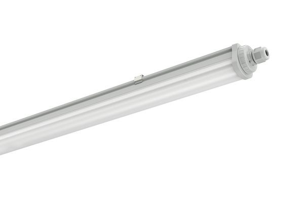 Deckenleuchte der PFSB2-Produktfamilie. Lichtlenkung durch Abdeckung opal, Ausstrahlungscharakteristik symmetrisch, diffus strahlend, Lichtaustritt direkt. Leuchtmittel LED-M eingebaut, Austausch durch Fachkraft. Die Leuchte generiert einen Bemessungslichtstrom von 6930 lm in Lichtfarbe 840, Lichtstrom einstellbar: in Stufen. Die hohe LED-Lebensdauer ermöglicht einen langen Einsatz bei gleichbleibender Beleuchtungsgüte. Hohe Lichtqualität durch eine Farborttoleranz von < 4 SDCM. Lichtstrom in Stufen einstellbar von 4770 - 6930 lm. Gehäuse aus Kunststoff, grau, Schutzart IP65, Stoßfestigkeit IK08 Deckenmontage über Befestigungsklammern (der Leuchte beiliegend) aus Edelstahl, an der Leuchte einrastbar (variabler Befestigungsabstand möglich). Mit elektronischem Betriebsgerät xFlex. Austausch durch Fachkraft. Nennspannung 220 - 240 V AC 50 - 60 Hz.