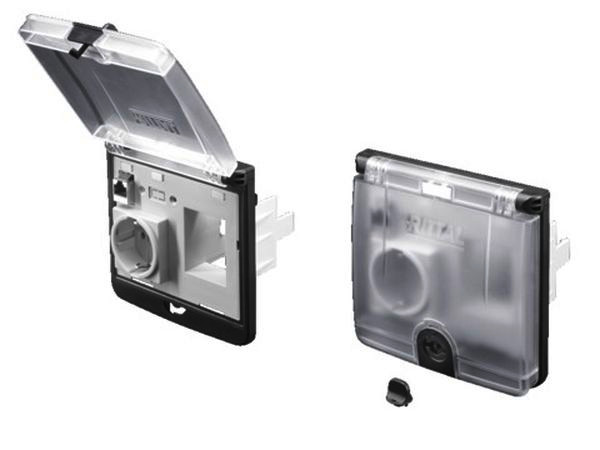 SZ Schnittstellenklappe, komplett, Einbaurahmen und Schnittstellen-Einsätze, mit Kunststoffklappe, halbtransparent, RJ45, Steckdosen-Modul Deutschland, Ausbruch zum Einsatz von FI-Schaltern
