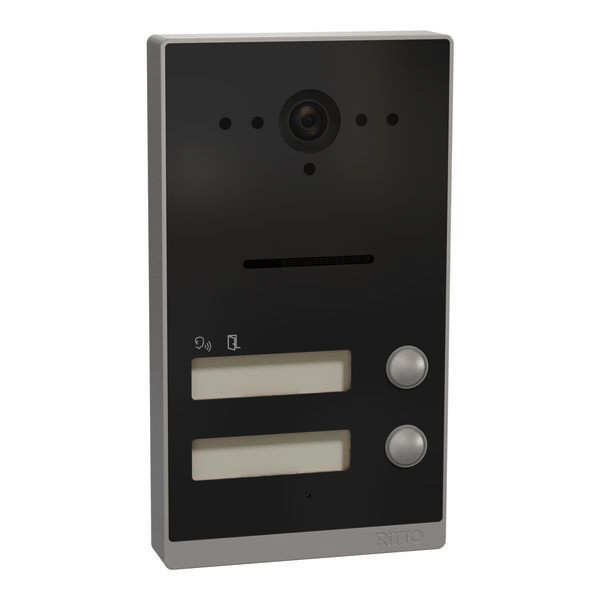 | Kurzbeschreibung | Listo Türstation, Twinbus IP, 2 Klingeltasten, Rahmen Silber, Anthrazitgrau, AP |