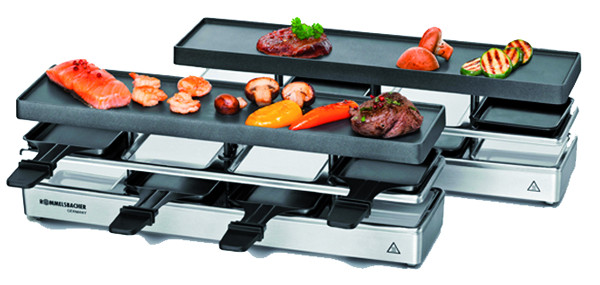2 Geräte mit je: massive Alu-Druckguss-Grillplatte 41 x 10 cm mit 2 Lagen Antihaftbeschichtung "Xylan Plus", antihaftbeschichte Pfännchen, 4 Schaber, Parkdeck für unbenutzte, heiße Pfännchen, stufenlose Temperaturregelung, Kontrolllampe,abnehmbares, extra langes Kabel (2m), inkl. 2 Netzkabel, 1 Verbindungskabel