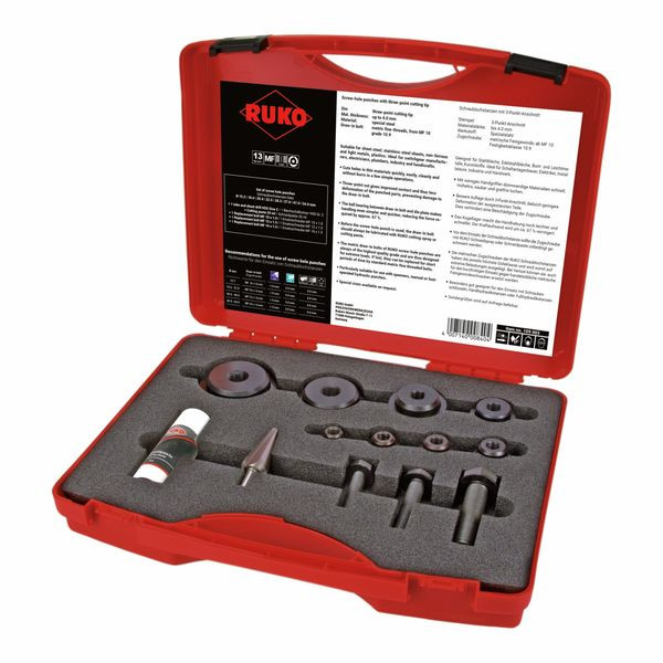 Mit wenigen Handgriffen dünnwandige Materialien schnell, mühelos, sauber und gratfrei lochen. Besonders gut geeignet für den Einsatz mit Schraubenschlüsseln, Handhydraulikstanzen oder Fußhydraulikstanzen. 13-teiliger Schraublochstanzen-Satz 8 Schraublochstanzen Ø 15,2 (PG 9) - 18,6 (PG 11) - 20,4 (M 20 / PG 13,5) - 22,5 (PG 16) - 28,3 (PG 21) - 37,0 (PG 29) - 47,0 (PG 36) + 54,0 mm (PG 42) + 1 Blechschälbohrer HSS Gr. 2 + 1 Schneidpaste 30 g + 1 Zugschraube MF 10 x 1,0 x 45 + 1 Zugschraube MF 12 x 1,5 x 55 + 1 Zugschraube MF 16 x 1,5 x 60