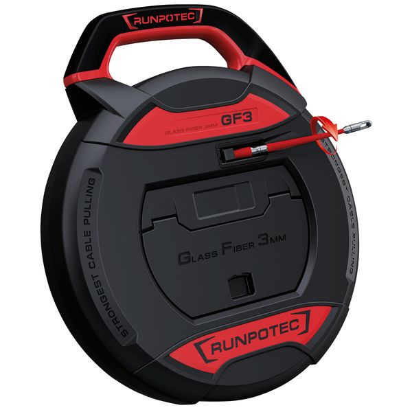 GF3 - Kabeleinziehgerät ohne Meterzähler, Glasfaserstab Ø 3 mm mit Knickschutz-Endhülse (Innengewinde RTG Ø 6 mm) und patentierter Führungsspitze mit Drallausgleich (2 x Außengewinde RTG Ø 6 mm). Verstaut in einer stoßfesten Kunststoffbox. Die Box ist spritzwasser- und staubgeschützt, extrem stoßfest und somit bestens für die Baustelle geeignet. Die GF3 - Kunststoffbox lässt sich mit nur einer Schraube für Servicearbeiten öffnen. Die Rückschub-Sicherung verhindert das unabsichtliche Rückrutschen des Glasfaserstabes in die Box. Des Weiteren verfügt die Box über einen ergonomischen Tragegriff sowie einer Anti-Rutsch Beschichtung. Im Lieferumfang ist ein 18-teiliges Zubehörset inkludiert. Die neu entwickelte Knickschutztechnik ermöglicht das Überwinden von Biegeradien bis zu R = 38 mm. Die angegebene Gesamtbruchlast von 130 kg bezieht sich auf den Glasfaserstab inkl. Knickschutzhülsen. Hervorragend geeignet in Kombination mit den RUNPOTEC Inspektionskameras.Die inkludierte Kabelziehschlaufe (Ø 14 mm Außen) mit eingebautem Drallausgleich und Schutzkappe kann für ein oder mehrere Kabel bis zu einem Kabeldurchmesser von Ø 12 mm verwendet werden. Schnelles Anhängen der Kabel an die Schlaufe. Eventuelle Stecker werden durch Zugbelastung am Kabel geschont.
