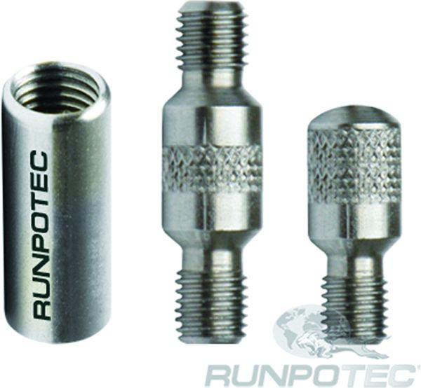 Verbindungsgewinde Set 3-teilig - Ersatzteilset für RUNPOSTICKS, GF3, alle Glasfaserstäbe oder RC2/ RC3 Inspektionskamera. Für RUNPOSTICKS: dient als Übergang von Innengewinde auf Außengewinde um alle Zubehörteile bzw. Ösen oder Haken zu verbinden. Für Glasfaserstäbe: dient vorwiegend um die RUNPOSTICKS als flexible Führungssonde mit dem jeweiligen Führungskopf (Laufrolle, Anfangsbirnen Ø 20 und 30 mm oder Schäkel) zu verbinden. Für RC2/ RC3 Inspektionskamera dient vorwiegend um den Systemgleiter an den jeweiligen Führungskopf (Laufrolle, Anfangsbirnen Ø 20 und 30 mm oder Schäkel) zu verbinden.