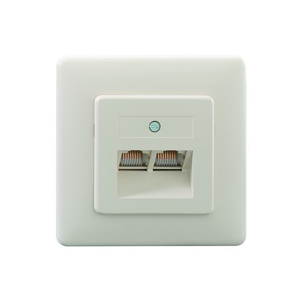 UAE-Anschlussdose, 2-fach, Unterputz, mit LSA-Anschlusskontakten, 2 x 8-polig, 2 x 8 LSA-Kontakte, mit Kunststofftragstegen, mit Spreizkrallen, reinweiß (ähnlich RAL 9010); - 8-polige Buchsenelemente, für 6- und 8-polige Stecker; - RJ11/12-Tauglichkeit ohne zusätzliche Reduzierelemente; - Kunststofftragstegen; - mit Spreizkrallen; - Stecköffnung schräg nach unten geneigt; - Schraubkontakte für einen Leiter bis 1mm Ø, 2 Adern je Kontakt; - LSA-Klemmen für einen Leiter 0,4-0,63 mm Ø, AW 26-22, Wiederbelegbarkeit > 50-mal; - vergoldete Kontaktoberflächen; - Nennspannung: 125 V; - Nennstrom: 1 A bei 50° C; - Spannungsfestigkeit: 1000 V, 50 Hz, 1 Min.; - Kontaktwiderstand: < 20 mOhm; - entsprechend nachfolgender Normanforderungen:; - TIA/EIA-568-B.2-2001, Cat. 3; - Lebensdauer: > 2500 Steckzyklen; - passend zu UAE-Designabdeckungen der Schalterindustrie (Berker, Busch-Jaeger, GIRA, Jung, Merten, usw.)