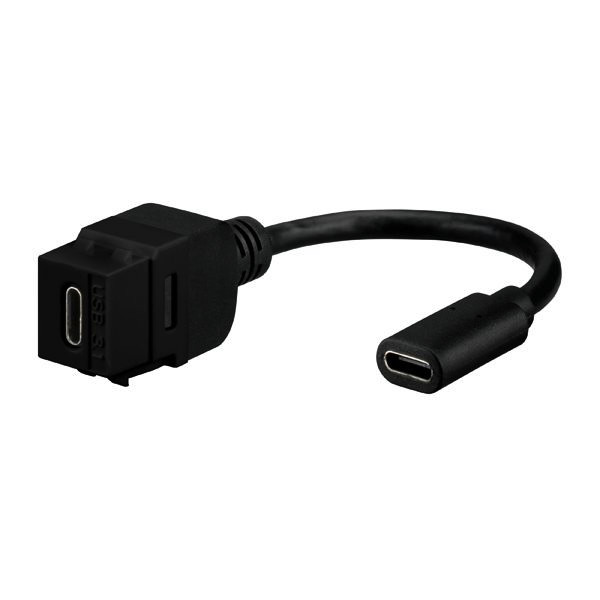USB 3.1-Keystone, Typ C (Buchse/Buchse), mit Kabelpeitsche (15 cm), für Montageadapter KMK-MA Up und andere Keystone-Aufnahmen, schwarz (ähnlich RAL 9005); - passend in Standard-Keystone-Öffnungen (14,7 x 19,3 mm); - 2 x USB 3.1, Typ C; - Durchführungsbuchse mit Kabelpeitsche (15 cm), einseitige Kontaktbelegung; - Übertragungsrate 5 Gbit/s; - für high-power - Anwendungen bis 100 W; - rückwärtskompatibel zu USB3.0/2.0/1.1