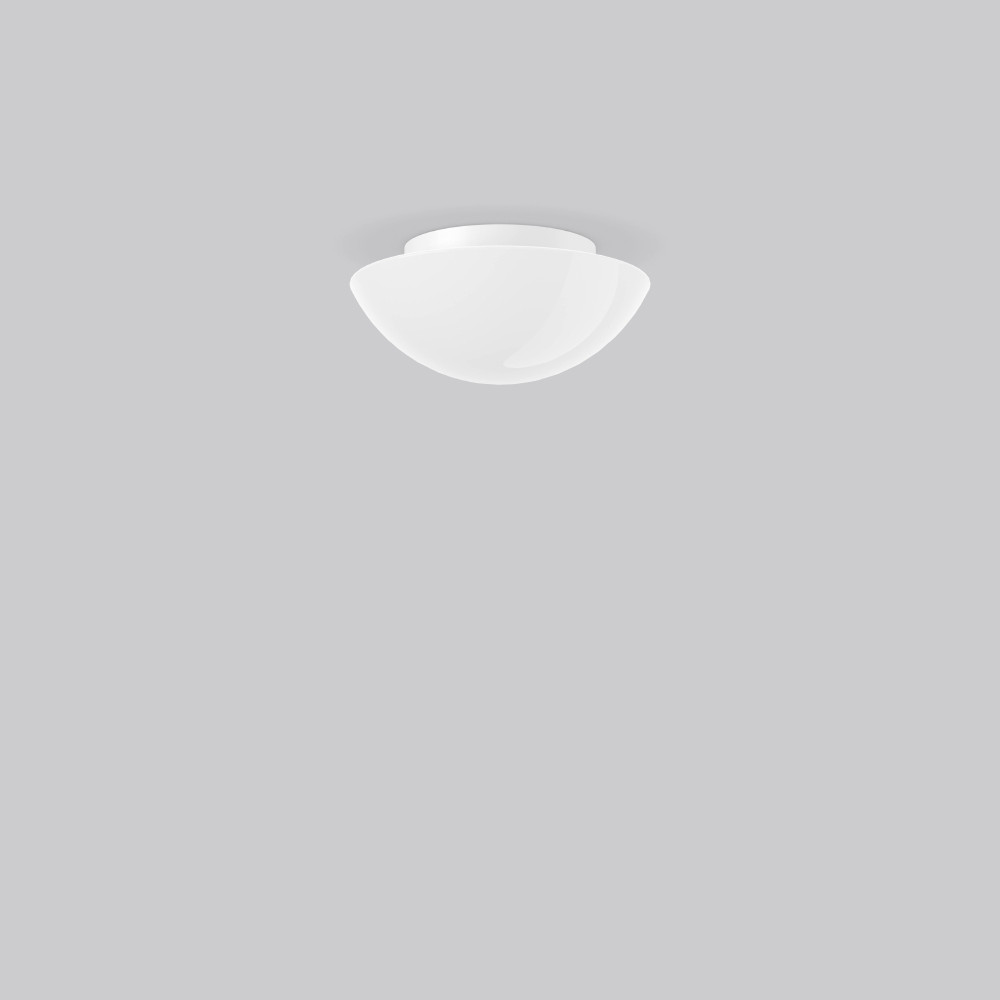 Dekorative runde Anbauleuchte für den Innen, und Außenbereich. Armatur Kunststoff. Mundgeblasenes Drei-Schicht-Opalglas (Triplex-Glas) seidenmatt. Glasbefestigung mit Federsystem. Geeignet für Deckenanbau, Wandanbau. IP 43 Deckenmontage, IP 44 Wandmontage.