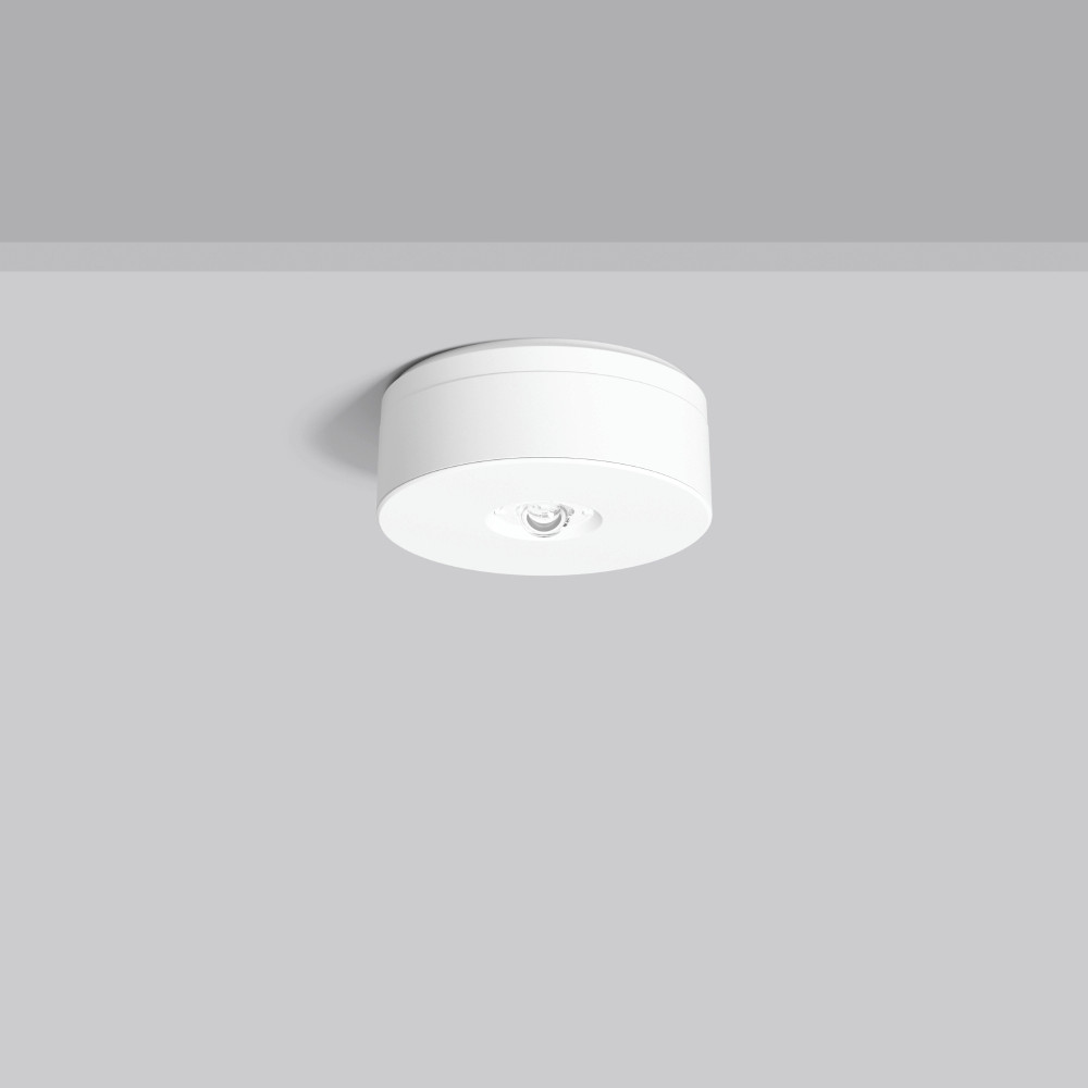 Rundes Anbau-Downlight. Zur Rettungswegbeleuchtung. Gehäuse Kunststoff (Polycarbonat). Abdeckung Kunststoff (Polycarbonat). Kunststofflinsen zur Flächen, und Rettungswegbeleuchtung im Lieferumfang enthalten. Geeignet für Deckenanbau. Betriebsgeräte integriert. Einzelbatteriesystem mit automatischem Selbsttest.