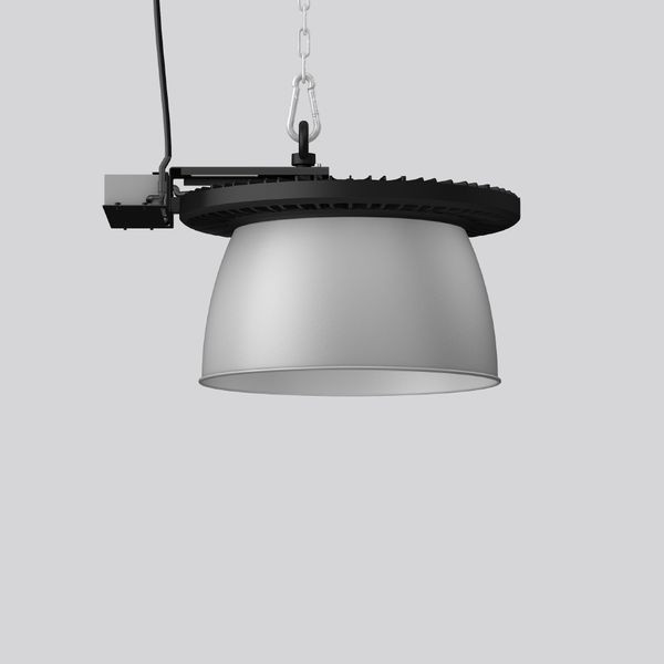 Runder Hallenstrahler für hohe Umgebungstemperaturen. Gehäuse Aluminium-Druckguss mit Ringöse, pulverlackiert. Diffusor aus entspiegeltem Einscheiben-Sicherheitsglas (ESG) klar. Reflektor aus mattiertem Aluminium. Primäre Lichtlenkung mit Hochleistungs-Flächen-LED. Einfache Installation durch Ein-Punkt-Aufhängung. Pendelabhängung über Kette oder Stahlseil bauseits. Zugelassen für den Einsatz in der Lebensmittel- und Getränkeindustrie. Leuchten mit begrenzter Oberflächentemperatur nach DIN EN 60598-2-24 zur Verwendung in einer Umgebung, in der eine Ablagerung von leitfähigem Staub auf der Leuchte erwartet werden kann.