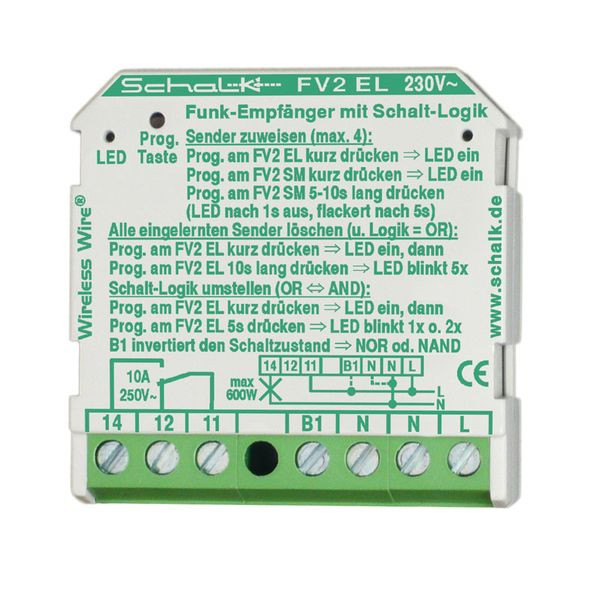 Funkverbinder-Empfänger für das FV2 System mit potentialfreiem 10A Wechslerkontakt. In Verbindung mit dem Batteriebetriebenen Funkverbinder-Sender FV2 SM lässt sich somit z.B. eine für geschlossene Räume häufig vorgeschriebene Zuluftüberwachung beim Betrieb von Abzugsventilatoren ohne die Verlegung von Leitungen realisieren. Beim FV2 EL ermöglichen die zusätzlichen Schaltlogik-Funktionen (OR, NOR, AND, NAND) eine gleichzeitige Auswertung von bis zu vier FV2-Sendern., Maße: 43x43x18,5mm, 230V AC - 1 Wechsler (potentialfrei) 10A