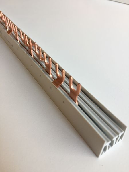 4-polige Phasenschiene, Gabelschuhausführung, Phasenfolge L1-N, L2-N, L3-N, ... Phasenschiene 4pol. für 2pol. LS od. FI-Schalter FI/LS Komb., Meterware, Gabelschuh, 10mm²/100A 54 Pole, Länge:1000mm, Mod.:17.8mm L1/N/L2/N/L3/N.