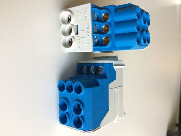 Verteilerklemme, Farbe:blau, Anschlüsse: 2x25mm² / 6x10mm², Ausführ.C (allseitig berührungsgeschützt)