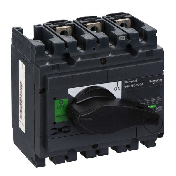 Drehantrieb frontal oder seitlich bis INS250 Compact INS Lasttrennschalter. Lasttrennschalter INS250, 200A/690V AC / 250V DC, Drehantrieb schwarz. Nennstrom 200 A, Polzahl 3. Komplettgeräte mit schwarzem Schalthebel. Trennereigenschaften nach VDE 0660 Teil 100. Drehantrieb frontal oder seitlich bis INS250.