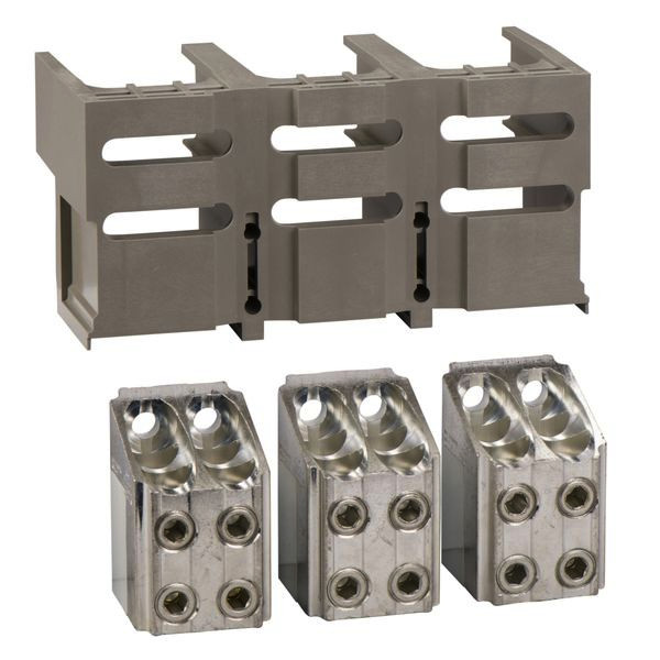 Bei diesem Zubehör handelt es sich um einen speziellen Satz von blanken Kabelsteckern und Klemmenabschirmungen für 3-polige, fest frontal angeschlossene ComPact NSX 630b-1600. Die blanken Kabelanschlüsse können bis zu vier 240mm² Kupfer- oder Aluminiumkabel aufnehmen. Die Klemmenabschirmung isoliert die Stromanschlusspunkte. Der Nennstrom beträgt bis zu 1250 A. Sie werden als 3-teiliger Satz verkauft.