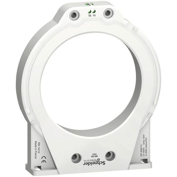 Dieser Ringkern ist für die Vigilohm Isolationsfehlersuchgeräte und die VigiPacT-Fehlerstromschutz- und Überwachungsrelais vom Typ A bestimmt. Es ermöglicht die Überwachung der eingespeisten Komponente von Vigilohm Insulation Monitor und die Messung eines Nennstroms bis zu 250A für VigiPacT-Überwachungs- und Schutzrelais. Das Übertragungsverhältnis beträgt 1/1000. Der Innendurchmesser des Toroids beträgt 120 Millimeter und das Gewicht 0,450 kg. Die Kabel müssen innerhalb des Toroids zentriert sein und der Durchmesser aller dieser Kabel sollte 60 mm nicht überschreiten. Der maximale Querschnitt pro Phase (R, S, T, N) beträgt 240mm² für einen Kupferleiter.