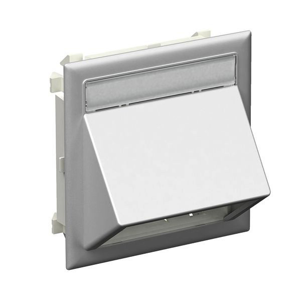 Basissatz BK1, Schrägauslass, Aluminium Metallic Typ: CYB-BK1-SA-Al-Metallic: Halogenfreier Basissatz, abgewinkelt, mit einem Etikettenfenster das auch nach dem Entfernen der Abdeckung im Unterteil verbleibt. Der Basissatz besteht aus einer Frontplatte und einem Montagerahmen. Er wird durch einfaches Einrasten eingesetzt. Der Basisatz ist rückwärtig vollständig offen, so dass die Datenleitungen mit dem erforderlichen Biegeradius verlegt und angeschlossen werden können. Daher ist keine Geräteeinbaudose notwendig.