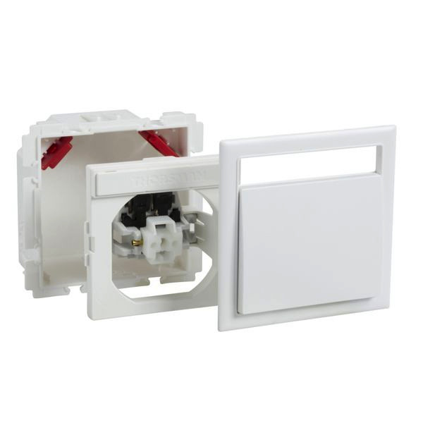 Anschusskit mit Dose Taster 1polig inkl Wippe + SF weiß RAL9016 TypCYB-PB. Schalter-Anschluss-Kit mit Dose, Schaltereinsatz, Adapter, zwei Zugentlastungsvorrichtungen, Abdeckung mit einer Wippe und Etikett mit Etikettenfenster. Einschaltposition unten oder oben. 250 V, 16 A. Material PC/ABS.