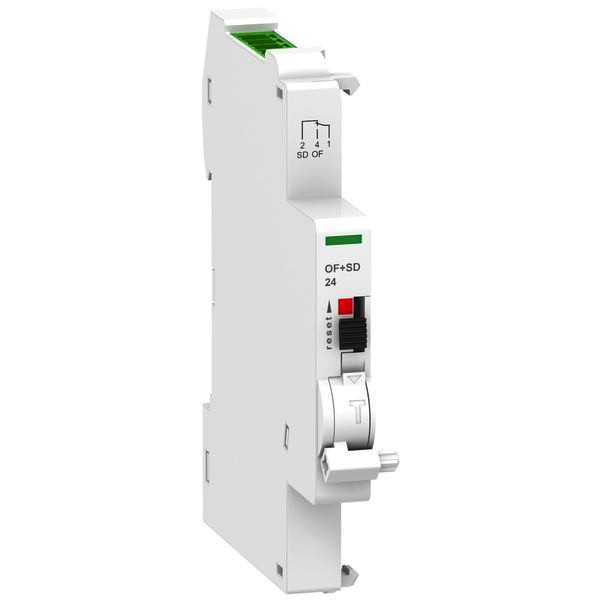 Kombinierter Hilfs-/Fehlermeldeschalter Acti 9 OF+SD24. Ti24-Schnittstelle, Betriebsspannung (Ue) 24V DC. Ansprechen des Fernauslösers (MN, MX). Fernmeldung der Schaltstellung und der Fehlerauslösung. Frontseitige mechanische Statusanzeige. Kombinierbar mit C60, C120, DPN, RCCB/ID, C60H-DC. Der kombinierbare Hilfs/Fehlermeldeschalter OF+SD24 erfüllt folgende Normen- IEC 60947-5-4.
