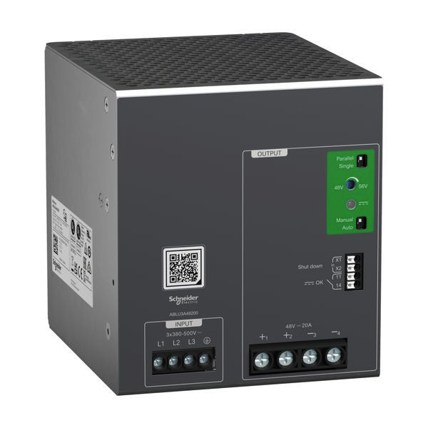 Kurzbeschreibung Spannungsversorgung, Modicon ABLU, Universal, getaktet, 380-500V AC, 3-phasig, 48V DC, 20A, 960W
