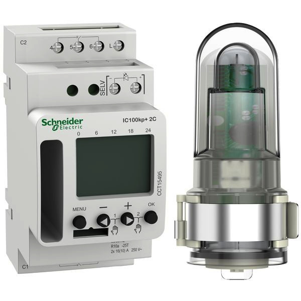 Dämmerungsschalter zur helligkeits- und zeitabhängigen Steuerung von Beleuchtungsanlagen. Die Beleuchtungsanlage wird eingeschaltet, sobald der eingestellte Helligkeitsschwellwert unterschritten wird oder die Zeitsteuerung das Schließen des Relais ermöglicht. Die Programmierung erfolgt am Gerät oder über die Smartphone App Acti 9 Light and Time Switch via Bluetooth Stick. Der Bluetooth Stick wird auch als Speicherkarte verwendet. Programmierbar auch über PC mittels Programmierkit CCT15860. CCT15494 Externer Eingang als Nebenstelle. Einstellbarer Schwellwert von 1-99.000 Lux. Verzögertes Ein- und Ausschalten einstellbar von 0 bis 5959 Minuten. Kurzanleitung im Aufbewahrungsfach. Für die Montage auf Hutschienen TH35. nach EN 60715. Funktionen -Ferienfunktion. Zeitlich begrenzte oder ständige Deaktivierung der Ein- und Ausschaltfunktionen. Automatische oder manuelle Umschaltung von Sommer-Winterzeit. Betriebsstundenzähler Anzeige der Betriebsstunden pro Kanal. Daueranzeige auf dem LCD-Display von Stunde und Minuten, Wochentag. Status des Ausgangskontaktes und des aktuelle Programms. Hintergrundbeleuchtung der Anzeige. Nennspannung AC 230,-15 %/+10 %, 50/60 Hz. Schaltleistung max 16 A, AC 250 V, cos phi1, 10 A, AC 250 V, cos phi0,6. Schaltleistung min 10 mA, AC 230 V, 100 mA, AC/DC 24 V. Kontakt potentialfrei. Standby-Leistung 0,3 W. Glühlampenlast 2600 W. Halogenlampenlast 2600 W. Leuchtstofflampenlast nicht kompensiert 2300 VA, reihenkompensiert 2300 VA, -parallel-kompensiert 730 VA (80 uF). Kompaktleuchtstofflampen 170 W. LED <2 W 30 W. LED >2 W 200 W. Anschlüsse Schraubklemmen, starr/flexibel 2x0,5 - 2,5 mm2, mit Aderendhülse max. 1x2,5 mm2. Bedienelemente 4 Tasten zur Menüführung. Ganggenauigkeit 7+/-0,25 s/Tag (25 GradC). Gangreserve10 Jahre. Schutzart Gerät IP 20. Gerätebreite 2,5 TE ca. 45 mm. Lieferumfang Außen Lichtsensor CCT15260.
