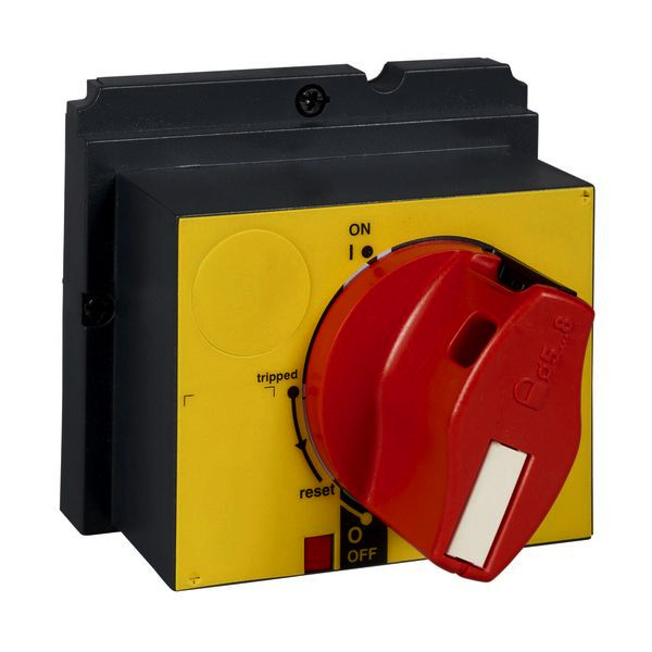 Drehantrieb für Motorschutzschalter TeSys GV7. Für die Verwendung mit allen GV7-Modellen ermöglicht sie die manuelle Betätigung eines Leistungsschalters durch einen Drehantrieb. Für die Verwendung von Haupt- und Notschaltern ist eine neue Frontabdeckung des Leistungsschalters mit einem roten, verriegelbaren Griff und gelber Frontplatte erhältlich. Er gewährleistet die Schutzart IP40 an der Vorderseite des Leistungsschalters.