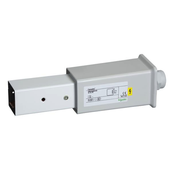 Canalis KBB. Einspeisekästen mit Endabdeckung. KBB Endeinspeisung, 1 Netz. Montage Rechts, Nennstrom 27 + 42 A, Polzahl 3L+N+PE. Für Beleuchtungsanlagen und Kleinverbraucher mit zwei Netzen und/oder schwere Leuchten. Stahlblech Weiß lackiert (RAL9003). Schutzart IP 55 und sprinklergeprüft. Option Integrierte Steuerleitung - DALI-fähig.