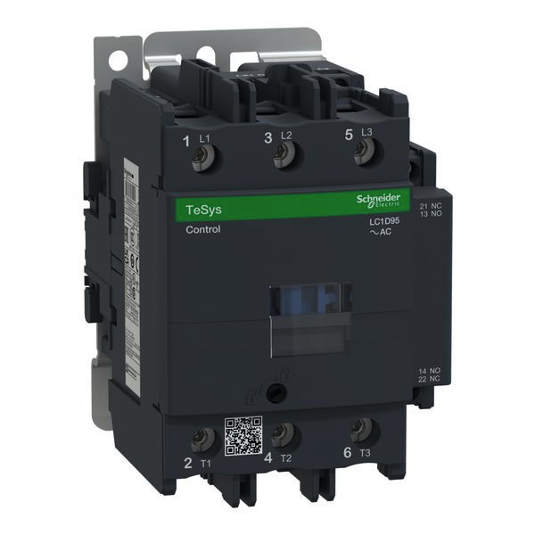 (von 18,5 bis 30 kW Hauptstrom mit EverLink-Klemmen). Leistungsschütz TeSys LC1D. 3 polig, 3 Schließer. Zusätzliche Hilfskontakte- 1 Schließer + 1 Öffner, Bemessungsbetriebsleistung bei AC-3, 400 V 45 kW, Bemessungsbetriebsstrom Ie bei AC-3, 400 V 95 A, Spule 230 V AC. Abmessung (BxHxT) 85x127x130 mm, Gewicht 1,61 kg. Kategorie AC-1, AC-3, AC-4. ohne integriertes Beschaltungsmodul. Schnelle und einfache Einrichtung. Sichere und langlebige Stromverbindung mit Everlink und Federklemmen. Geeignet für Sicherheitsanwendungen durch mechanisch gekoppelte Kontakte und Spiegelkontakte. Zertifizierungen nach LROS (Lloyds register of shipping), DNV, GOST, RINA, CCC, BV, GL. Produktstandards gem.
