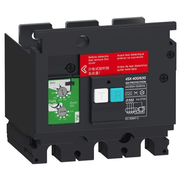 Dies ist ein Vigi-Zusatzmodul für ComPact NSX 400/630, das den Fehlerstromschutz bietet. Er wird für 3-polige Leistungsschalter verwendet. Die Betriebsspannung liegt zwischen 440 und 550 VAC 50/60 Hz. Die Differenzstromempfindlichkeit ist von 30 mA bis 30 A einstellbar. Er wird direkt auf die Geräteanschlussklemmen aufgesteckt und betätigt bei einem Fehler durch Fehlerstrom direkt den Auslöser. Dieses Vigi-Zusatzmodul wird intern von der Spannung des Verteilernetzes gespeist, auch wenn es nur von 2 Phasen versorgt wird. Es ist konform mit der Norm IEC 60947-2, Anhang B.