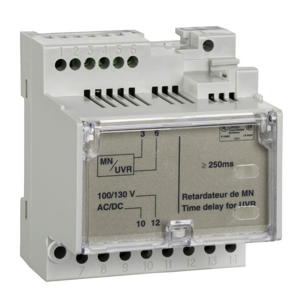 Um Fehlauslösungen des Leistungsschalters bei kurzzeitigen Spannungsabfällen zu verhindern, kann diese Verzögerungseinheiten MN eingebaut werden, um den Unterspannungsausloser MN zu verzögern. Die Auslösung wird nur dann zu bewirkt, wenn die Spannung für einen bestimmten Zeitraum zu niedrig ist. VerzögerungseinheitMN Unterspannungsauslöser200/250VAC/DC feste Zeit. Verzögerungszeit fest 0,25s. Er kann mit einem Not-AUS-Schalter deaktiviert werden, um ein unverzögertes Ausschalten des Leistungsschalters zu erreichen.