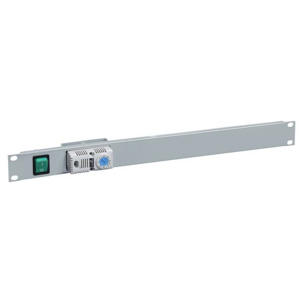 An den 19-Zoll-Schienen befestigte Frontplatte mit Lüftungsschalter und Thermostat für das Wärmemanagement. Stahlblech, RAL7035, lichtgrau. Die Höhe der Blende beträgt 1HE. Der Thermostat kann die Temperatur von 0°C bis +60°C messen. Der zugehörige Kontakt erlaubt einen Strom von 5 Ampere bei 250 V. Produktfamilie Actassi.
