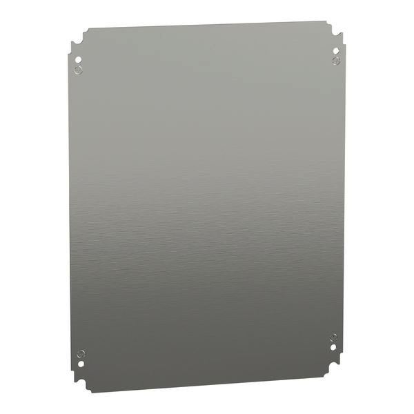 Glatte Montageplatte für PanelSeT CRN, S3D, S3X, PLM. Für Gehäuse H500 x B400 mm. Universelles Montagezubehör. Montageort des Stufenschlittens oder direkte Befestigung an den Hinterlegern (Schrauben M8). 90 Kg zulässige Last. Verzinkter Stahl. Satz von 1.