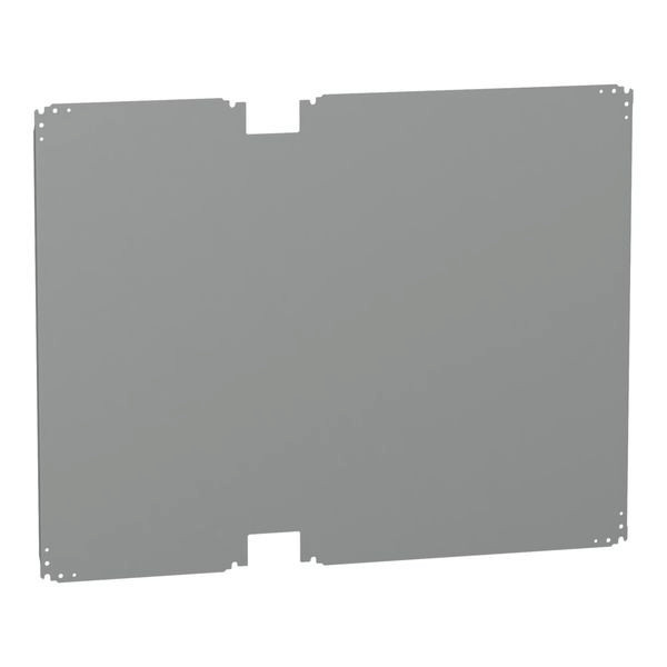 PanelSeT PLA Metall-Montageplatte. Für Gehäuse H1000 x B1250 mm. Die Montageposition der Stufenschlitten oder die Position der hinteren Einsätze (Befestigung mit Schrauben Typ M8). Glatte Montageplatte. 150 Kg permanente zulässige Last. Verzinkter Stahl. Grau RAL 7035.