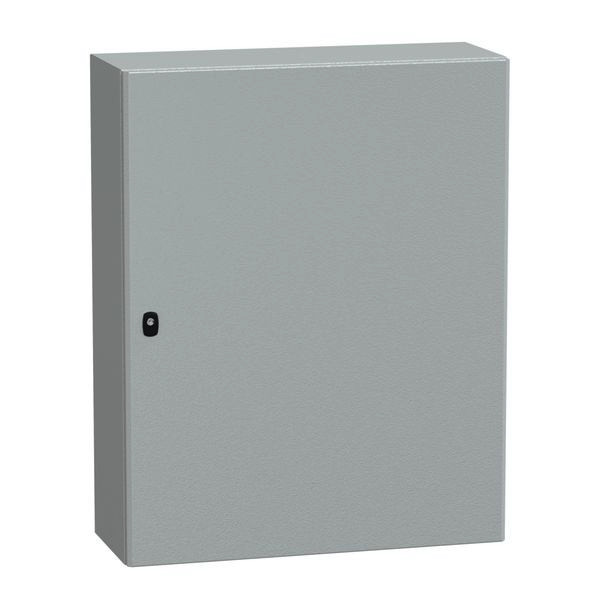 PanelSeT S3D Wandgehäuse aus Stahl mit glatter Tür. Einteiliges Gehäuse, inkl. Montageplatte. 3-Punkt-Verschlusssystem mit Handgriff und 3-mm-Doppelstabschlosseinsatz. Aus Stahl, Epoxid-Polyester-Pulverlackierung. Schutzart IP 66, IK10, Grau RAL 7035.