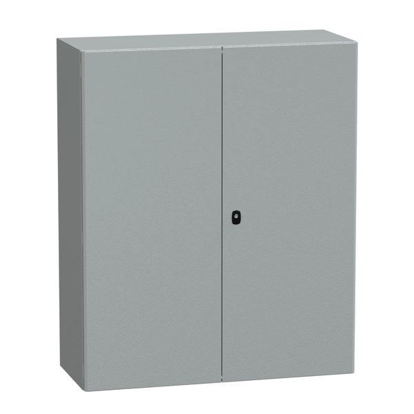 PanelSeT S3D Wandgehäuse aus Stahl mit 2 Volltüren. 1200 x 1000 x 400 mm. Einteiliges Gehäuse, inklusive Montageplatte. 3-Punkt-Verschlusssystem mit Griff und 3 mm Doppelbartschliessung. Aus Stahl, Epoxid-Polyester-Pulverbeschichtung. Schutzart IP 55, IK10, Farbe RAL 7035. 2 Kabelverschraubungsplatten im Lieferumfang enthalten, Standard.