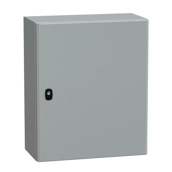 PanelSeT S3D Wandgehäuse aus Stahl mit glatter Tür. Einteiliges Gehäuse, inkl. Montageplatte. 3-Punkt-Verschlusssystem mit Handgriff und 3-mm-Doppelstabschlosseinsatz. Aus Stahl, Epoxid-Polyester-Pulverlackierung. Schutzart IP 66, IK10, Grau RAL 7035.