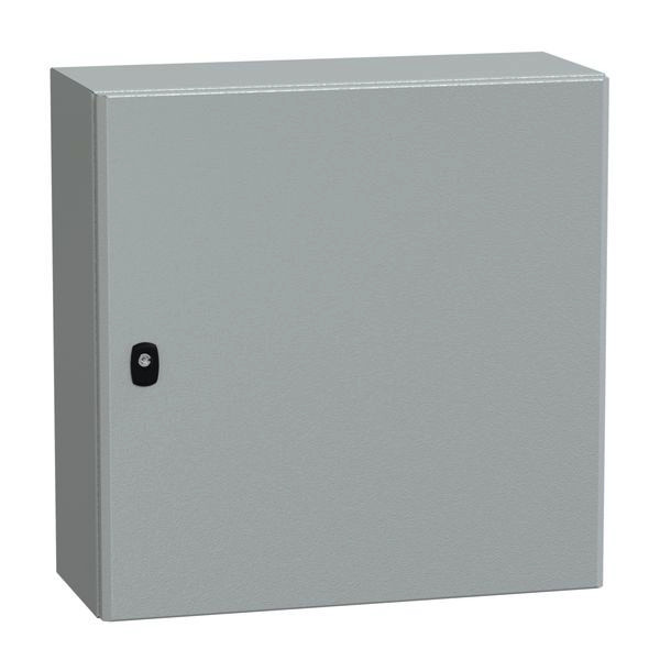 PanelSeT S3D Wandgehäuse aus Stahl mit glatter Tür. Einteiliges Gehäuse, inkl. Montageplatte. 3-Punkt-Verschlusssystem mit Handgriff und 3-mm-Doppelstabschlosseinsatz. Aus Stahl, Epoxid-Polyester-Pulverlackierung. Schutzart IP 66, IK10, Grau RAL 7035.