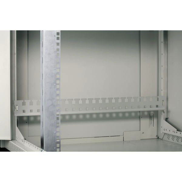 Kabelträger für Gehäuse aus verzinktem Stahl, der die Befestigung und Führung der Kabel an der Rückseite des Gehäuses ermöglicht. Wird an der Rückseite des Gehäuses befestigt, um die Kabel zu stützen und zu befestigen. Produktfamilie Actassi. VPE 1.