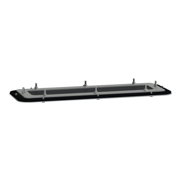 Flexible Flanschplatte für PanelSeT S3D mit Membran. B345 x T130 mm. Zubehör für die Kabelführung. Flanschplatte wird an der Unterseite des Gehäuses montiert. Ausbrüche für Kabel mit Schraubendreher durchstechbar. Stahlplatte mit flexibler HCE Membran. Grau RAL 7035.
