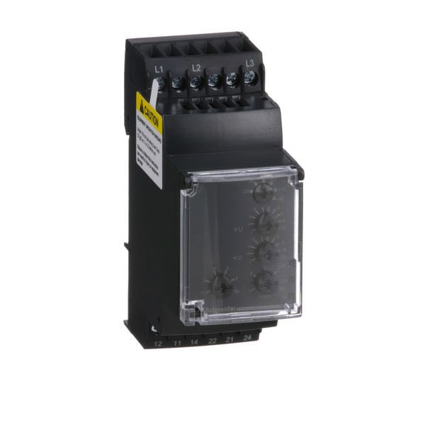 Harmony Control. Dieses Netzüberwachungsrelais überwacht Drehstromnetze (220-480 VAC in 6 Stufen) auf Phasenfolge, Phasenausfall, Phasenasymmetrie (5-15%), Über- und Unterspannung im Fenstermodus (-20--2%/+2-+20% je nach Spannung). Zur Meldung sind 2 Relaiswechsler vorhanden, die bis 5 A belastbar sind. Für die Asymmetrie, Unter- und Überspannungsbereich ist der Grenzwert und für den Ausgang ist eine Abschaltverzögerung einstellbar. Die Einstellungen erfolgen über Bedienelemente in der Front, die unter einer Klarsichtabdeckung gegen Veränderungen geschützt werden können. Drei LEDs zeigt den Status an. Die Baubreite beträgt 35 mm und die Montage erfolgt auf der Hutschiene. Der Leitungsanschluss erfolgt über Schraubklemmen.