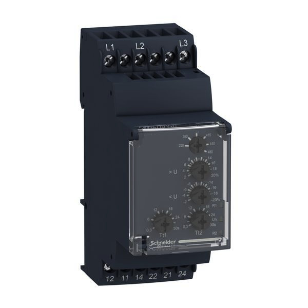 Phasenausfall, Unter- und Überspannung zwischen Phasen. Harmony Control. Dieses Spannungsüberwachungsrelais überwacht dreiphasige Versorgungen (220-480 VAC) auf Phasenausfall, sowie die Netzspannung auf Über- und Unterschreitung eines einstellbaren Grenzwertes (-20--2%/+2-+20% je nach Spannung). Zur Meldung sind zwei Relaiswechsler vorhanden, die bis 5 A belastbar sind. Dabei steht jeweils ein Relais für die Über- und Unterschreitungsmeldung zur Verfügung. Beim Phasenausfall schalten beide Relais. Die beiden Grenzwerte und eine Abschaltverzögerung sind einstellbar. Die Einstellungen erfolgen über Bedienelemente in der Front, die unter einer Klarsichtabdeckung gegen Veränderungen geschützt werden können. Zwei LEDs zeigt den Status an. Die Energieversorgung des Gerätes wird der Messspannung entnommen. Die Baubreite beträgt 17,5 mm und die Montage erfolgt auf der Hutschiene.