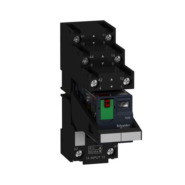 Harmony Relay. Vormontiertes und direkt einsetzbares Miniaturrelais RXM bestehend aus Relais, Sockel, Haltebügel und Beschriftungsschild. Anzahl Kontakte- 2, Ausführung- Relaiswechsler, Kontaktbelastbarkeit- je 12 A. Spulen-Steuerspannung- 24 VAC. Mechanische Stellungsanzeige- ja, LED-Anzeige- ja. Prüftaste zum Testen der Kontakte- ja, Prüfhebel zur dauerhaften Umschaltung für Testzwecke- ja, Bedienung- werkzeuglos. Stecksockel mit Schraubklemmen in getrennter Anordnung zur Montage auf Hutschiene oder aufschraubbar auf Montageplatte. Kunststoffhaltebügel zur Fixierung und einfachen Entnahme des Relais. Beschriftungsschild zur Kennzeichnung. Alle Komponenten sind einsatzfertig montiert und das vormontierte Relais kann sofort eingesetzt werden.