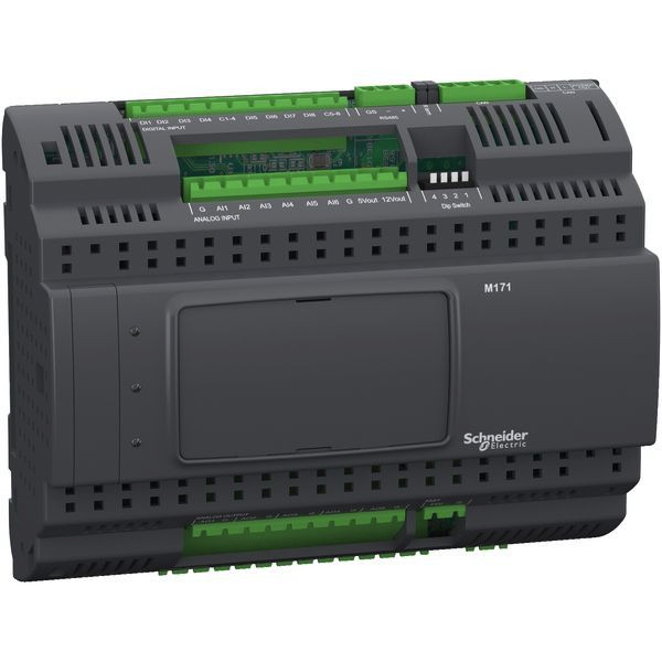 Die SPS-Steuerung Modicon M171 in Performance Ausführung ist für einfache und kompakte Applikationen aus dem Bereich HLK-Maschinen und Pumpenautomatisierung ausgelegt. Verschiedene Scchnittstellen ermöglichen die Vernetzung z.B. mit GLT-Systemen. Insgesamt 27 integrierte E/A, davon 8 digitale und 6 konfigurierbare (U/I/T/R) analoge Eingänge, 7 digitale und 5 konfigurierbare (U/I) analoge Ausgänge. Integrierte Modbus SL Schnittstelle die auch Remote-Download ermöglicht. Die Spannungsversorgung erfolgt über 24 VAC / 24 VDC oder 48 VDC. Die digitalen Ausgänge sind als Relais (2x 8A / 230VAC und 2x 5A / 230VAC)ausgeführt. Die Anschlüsse erfolgen mittels abnehmbaren Schraubklemmleisten (nicht im Lieferumfang enthalten). Montage auf 35mm Hutschiene. Wird mit kostenfreier Software EcoStruxure Machine Expert - HVAC programmiert.