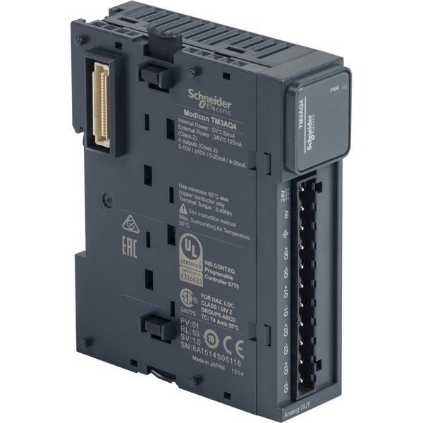 Analoges Ausgangsmodul Modicon TM3. Zur Erweiterung von Modicon M221, M241, M251 und M262 SPS-Steuerungen mit E/A-Kanälen. Kompatibel mit Drittanbieter-Steuerungen mittels Modicon TM3 Buskoppler. Insgesamt 4 analoge Ausgänge (-10V bis +10V / 0V bis 10V / 0mA bis 20mA / 4mA bis 20mA) mit 12Bit Auflösung. Projektierung und Konfiguration mittels Software EcoStruxure Machine Expert oder Standalone Konfigurator (Download über www.se.com). Anschluss über abnehmbare Schraubklemmleisten mit Rasterabstand 5,08mm. Umgebungstemperatur im Betrieb -10°C bis +55°C. Montage auf 35mm DIN-Hutschiene oder direkt auf Schalttafel mit optionalem Halter. Zertifizierungen nach CE, cULus/CSA, EAC, RCM, cULus Hazardous Location.