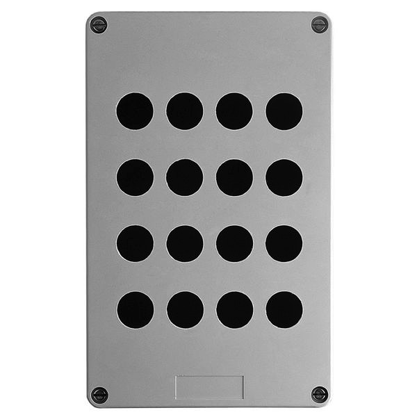 Leeres Steuergehäuse aus Kunststoff, 16 Öffnungen in 4 Spalten. Es ist Teil der Baureihe Harmony XAP, XB2 SL Metallgehäuse, für Harmony XB4.