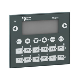 LCD-Anzeige hinterleuchtet, Matrix-Display mit 1-4 Zeilen mit 5-20 Zeichen, Zeichen sehr groß darstellbar (17 mm hoch) bis zu 1 Zeile mit 5 Zeichen, 8 Systemtasten, 12 Funktionstasten (auch für numerische Eingaben), mehrsprachig, 128 Zeichen zur freien Verfügung, 200 Applikationsseiten, 256 Alarmseiten, Kommunikation per Modbus oder Uni-Telway.