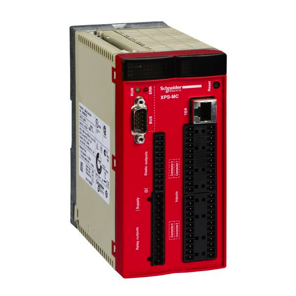 Preventa kompakter Sicherheitscontroller XPSMC. Kompakter Sicherheitscontroller zur Realisierung von Sicherheitsanwendungen. Controller mit 32 sicheren digitalen Eingängen, 6 sichere Transistor-Ausgänge und 2x 2 sichere Relaisausgänge. Konfiguration durch den Anwender mit Software XPSMCWIN. Erreichbares Sicherheitsniveau bis Kat. 4, PL e, SIL 3. Buskommunikation Modbus und CANopen. Anschlussklemmen bitte separat bestellen. Versorgungsspannung 24 VDC.