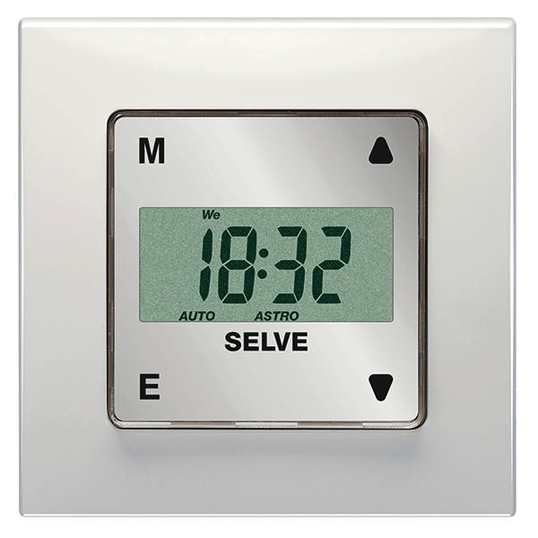 Digital-Zeitschaltuhr, Unterputz, Gangreserve, für einen Wechselstrom-Motor, Tages- und Wochenprogramm, Astro-Abend Programm, Zufallsgenerator, silbernes Display mit Flanschrahmen in alpinweiß, Lichtsensor anschließbar für Sonnenschutz- und Dämmerungsfunktion