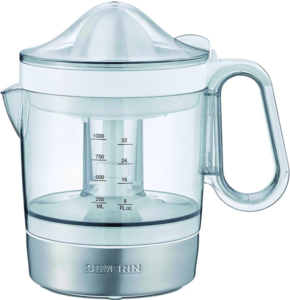 2 verschieden große Presskegel für alle Fruchtgrößen, transparenter XXL Saftbehälter 1000 ml mit beidseitiger Mess-Skala, automatischer Start bei Druck auf den Presskegel, praktischer Rechts-Links-Lauf für perfekte Saftausbeute, Fruchtfleischanteil individuell regelbar